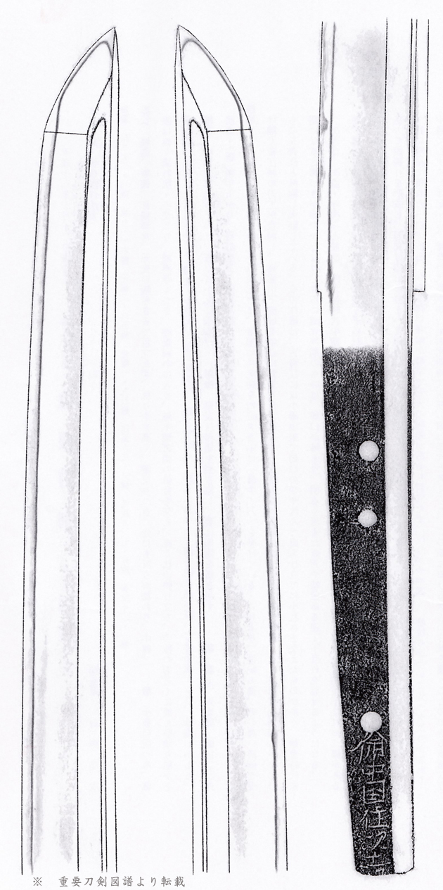 刃長 : 72.8cm (2尺4寸) 反り : 1.6cm (5分) 元幅 : 2.85cm 先幅 : 1.95cm 元重 : 0.6cm 先重 : 0.45cm |
