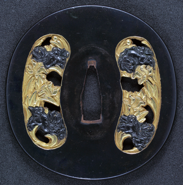 目貫 : 黒呂色塗鞘打刀拵 総長 : 100.0cm 獅子牡丹図、竪丸形、赤銅磨地、両櫃の中に欄間透かし金色絵、無銘 高さ:8.0cm 幅:7.8cm 厚さ:4.5cm 白鮫着、黒糸菱巻。長さ:23.0cm 獅子の子落とし図、赤銅魚子地、高彫、象嵌色絵、銘:柳川直光(花押)(と銘がある) 高さ:3.9cm 幅:2.3cm 獅子牡丹図、赤銅地、容彫金色絵。 |