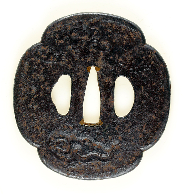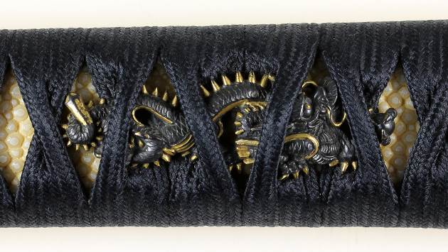 目貫 : 黒呂色塗鞘打刀拵 総長 : 108.7cm 瑞雲に昇龍図、木瓜形、鉄地、真鍮地、両櫃孔、□松堂利正 高さ:9.0cm 幅:8.4cm 厚さ:0.55cm 白鮫着、紺糸柄巻。長さ:25.0cm 砂潜龍図、赤銅魚子地、高彫、色絵、高光 高さ:4.3cm 幅:2.4cm 這龍図、赤銅容彫、金色絵 |