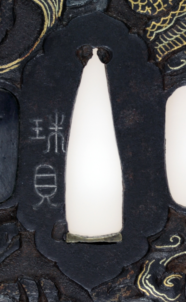 この鐔は、表の切羽台左側に銀象嵌で「珠貝」と作者名が入っている。金工辞典(若山泡沫:著)によれば「珠貝(しゅがい):金象嵌の二字銘で南蛮風の鐔を造る。中国人か。江戸中期」とあり、清国、或いは日本の長崎にて製作を行っていた中国人の金工と思量される。 本作は、大振りで重ねやや厚く、八角形、やや幅の広い鋤残土手耳には上部に大きく羽ばたく鳥を耳にかけて金銀象嵌で仕上げ、表裏に蔦を銀唐草と金の布目象嵌で飾っている。表面の図は、鳳凰を右側に阿形で、左側に龍を吽形の形で、下部に波を鋤出彫にて金銀象嵌であらわしている。裏面は、鳳凰と龍を阿吽の形を逆にしてあらわしている。彫口が緻密で図柄が豪華であり、象嵌の欠落がほとんどなく、完璧な状態でのこされており、加えて在銘は極めて貴重といえる。