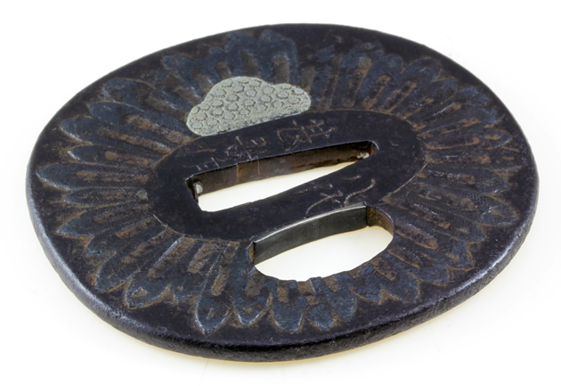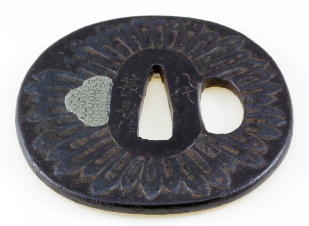 説明 : 丸形に近い長丸形で、表裏の地面いっぱいに袋菊を表現している。やや具象的な菊である。平地には大きな変化はないが、焼き手による微妙な変化と丸みがあり、この鐔の鑑賞価値を高めている。特別な注文であろうか、銘を裏側に切っている。「八代甚吾作」だけでは、三代との区別が困難であるが、三代永次の「甚吾」銘とは書風が異なっている。 |