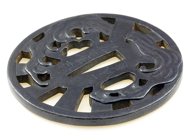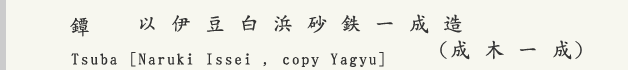 説明 : 成木一成氏は、昭和6年生まれで、故高橋介州氏に師事した。成木氏は長年にわたり、尾張・赤坂・金山鐔などの鉄鐔の復元を試み、自ら材料の砂鉄を全国各地から集め、自家製たたら製鉄によってその地鉄の再現に努めた。また、鉄地の表面処理の焼手腐らかし技法の復活にも挑戦しせいこうするなど、氏独自の鉄鐔の世界を展開している。 本作は、柳生三十六歌仙のなかでも代表的な画題の一つである「水車」を写している。鐔全体で水車を表現し、その中に躍動感ある荒波を立体的に表した入念作となっている。柳生鐔の掟通りに耳は柾目となり、鍛えが強いためか少しく割れがみられるが美観を損なうほどではない。昭和60年の製作にて、伊豆白浜の砂鉄を用いた旨が銘された入念作となっている。 なお、岐阜県博物館において平成25年4月27日(土)〜6月30日(日)まで、「鍔の美−鍔工・成木一成の挑戦−」が開催されおり、近隣の方には是非お出かけいただきたい。