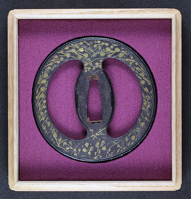 大振りの鐔の左右を大きく海鼠透かしにし、表裏を秋の代表的な草花の一つである萩の花を画面いっぱいに金布目象嵌した、見た目にも豪華な鐔である。