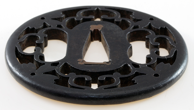 竪丸形、鉄磨地、地透、毛彫、丸耳、片櫃仕立 |