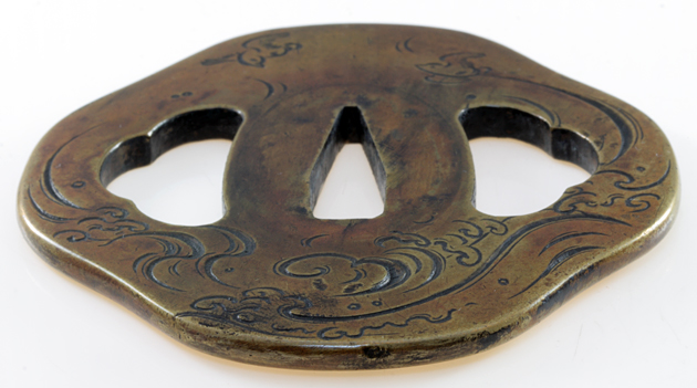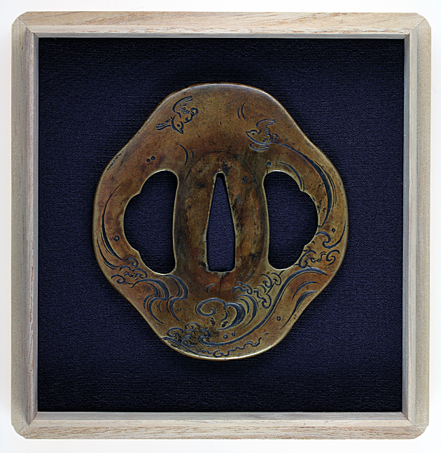 説明 : 肥後鐔において真鍮地や木瓜形の鐔は、西垣に多くみられるもので、両櫃がやや大きいものは三代の時代のものに多い。 この鐔は、下半分は片切彫と毛彫にて、逆巻く波を力強く彫り、上部には戯れる二羽の千鳥を毛彫にて彫っている。 |