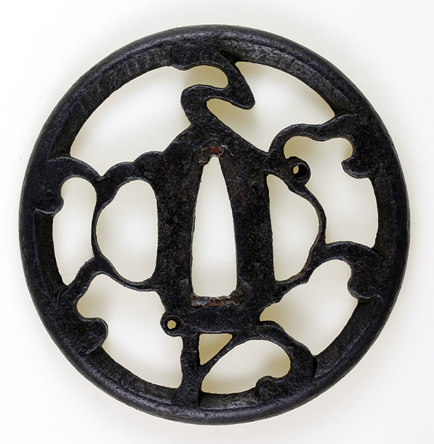 説明 : やや大振りにて、重ねが厚く、独特の丸耳にて重量感がある。両櫃も大小変化をもたせ古赤坂らしい。地鉄は、青味かかっており、槌目地立てにて、力強い。但し、保存状態が今一つであり、もう少し手入れをしてみたい鐔である。画題は、花卉透しとあるが、草花に花をつけ、全体に動きが感じられ、小さな水玉を透かしている。鐔の内側は片削ぎ風にしてあり、これも赤坂風らしい。古赤坂の極めであるが三代正虎に近い作域を示している。 |